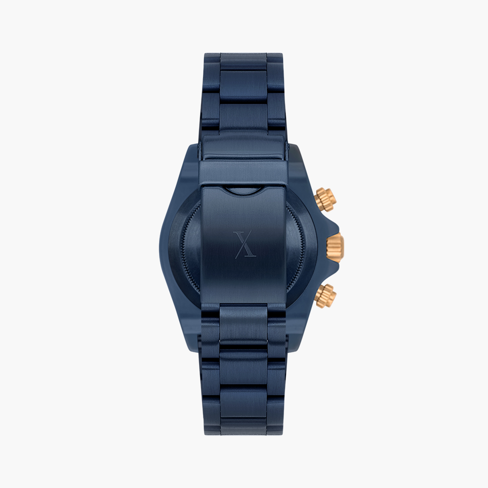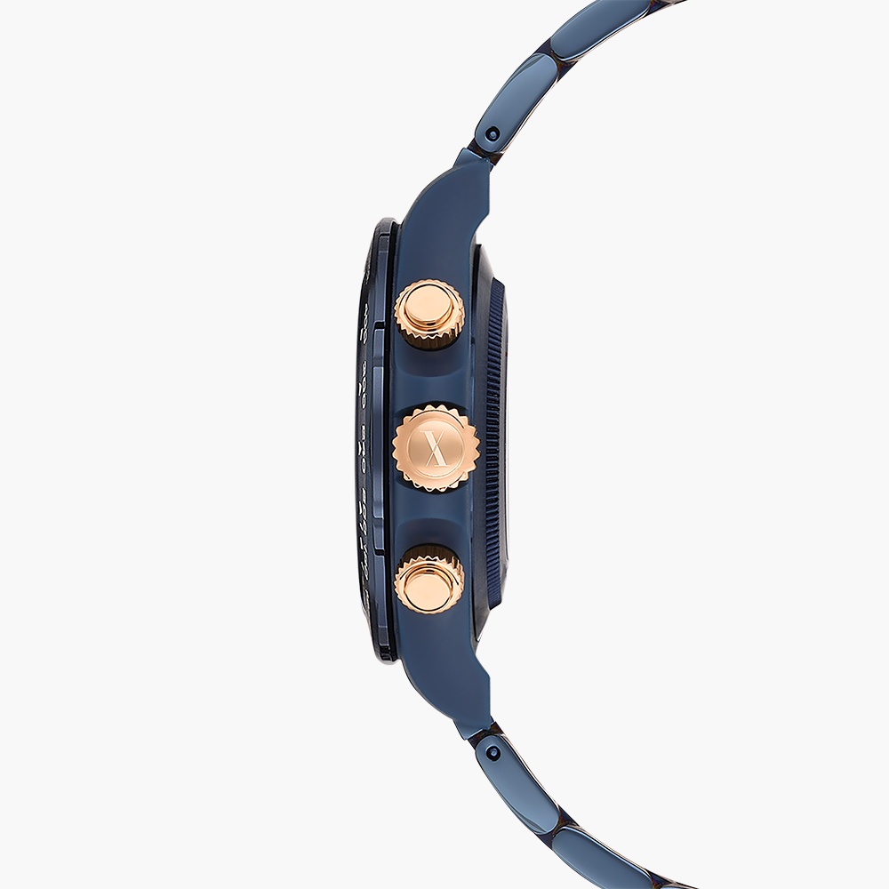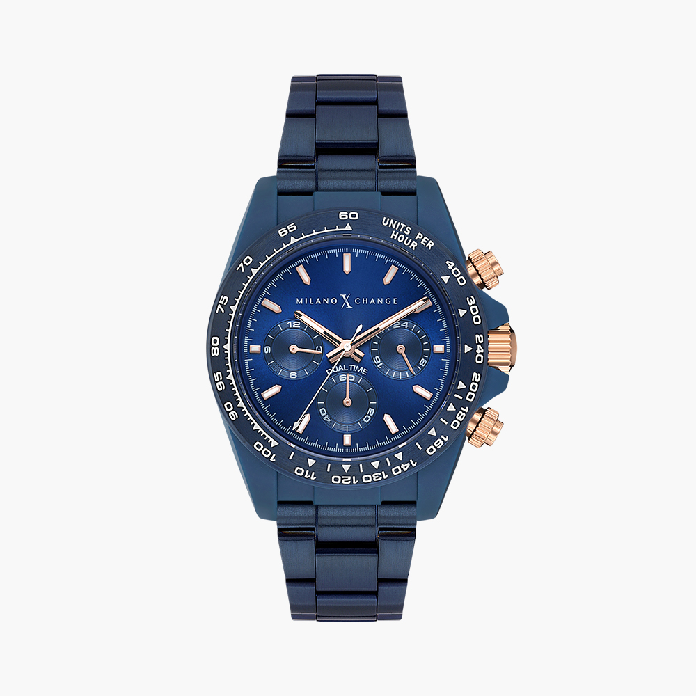 Plastic case, Analog quartz movement, Blue dial, Stainless steel bracelet