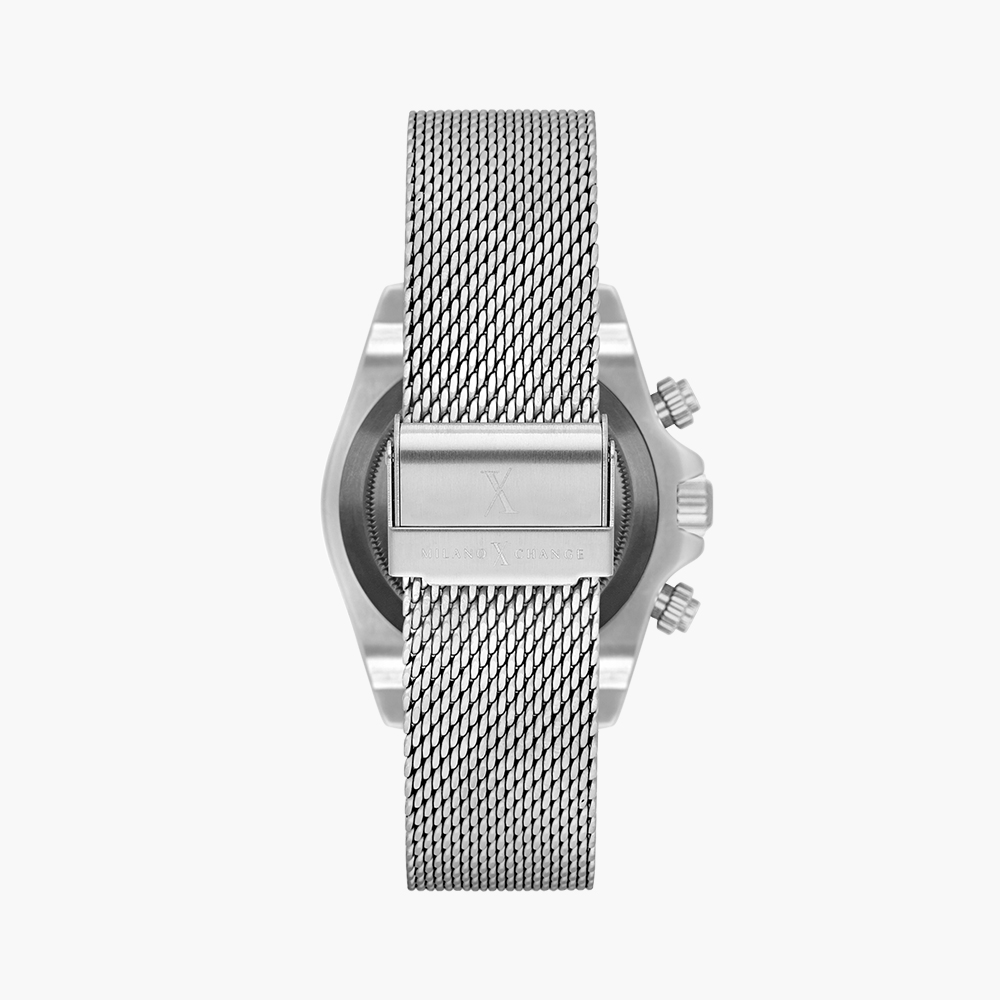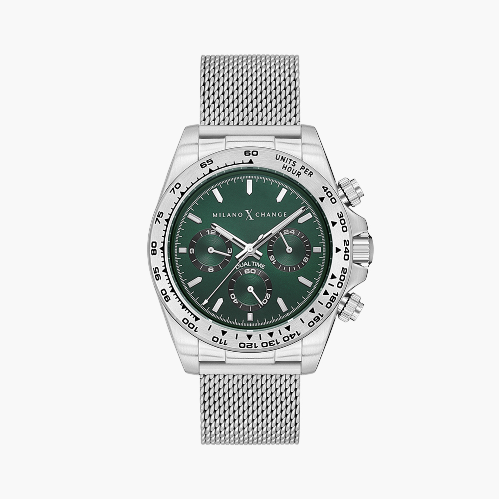 Stainless steel case, Analog quartz movement, Green dial, Mesh bracelet