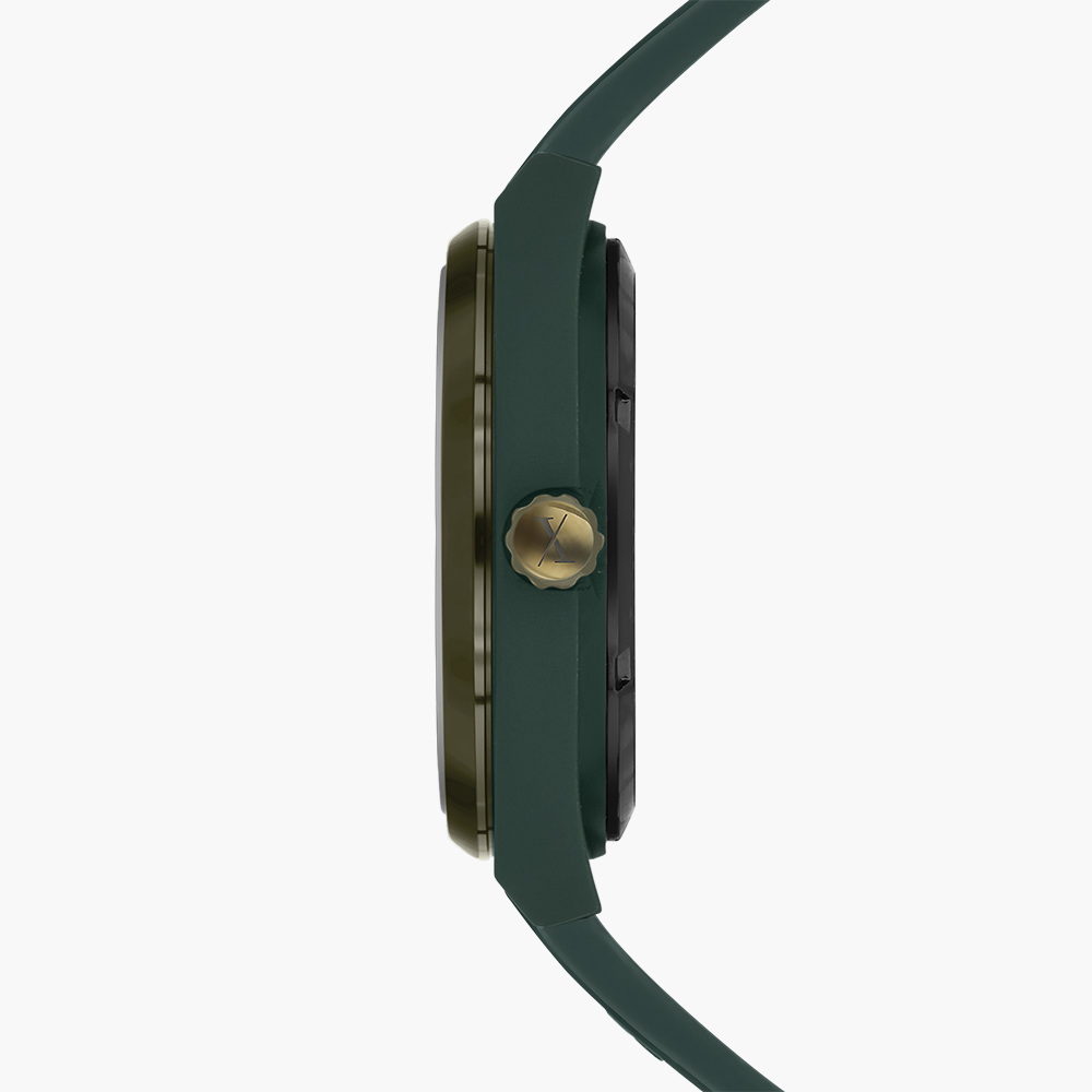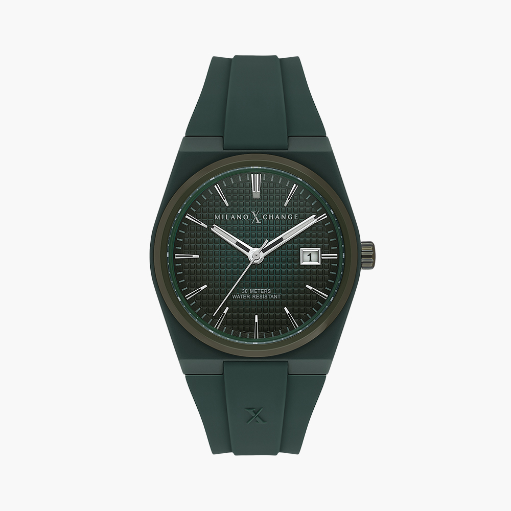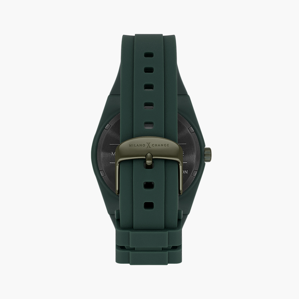 Plastic case, Analog quartz movement, Green dial, Silicone strap