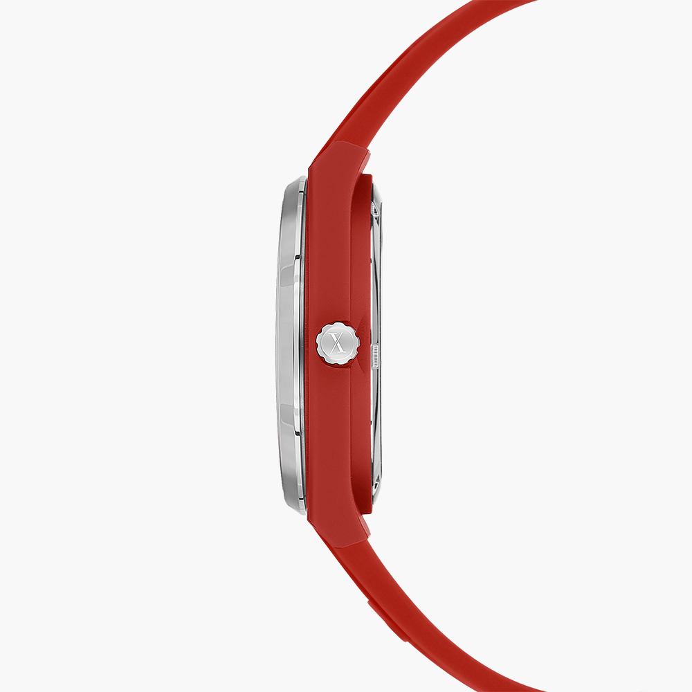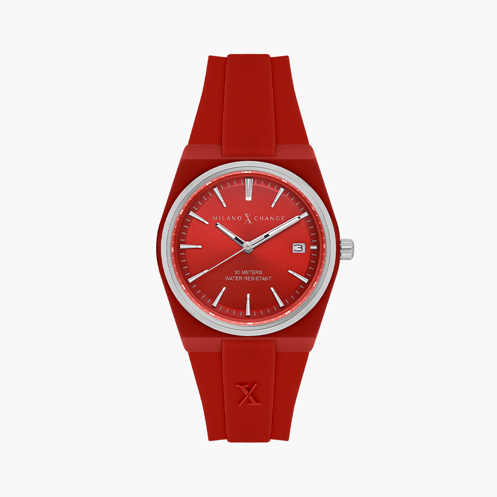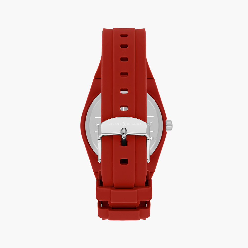 Plastic case, Analog quartz movement, Red dial, Silicone strap