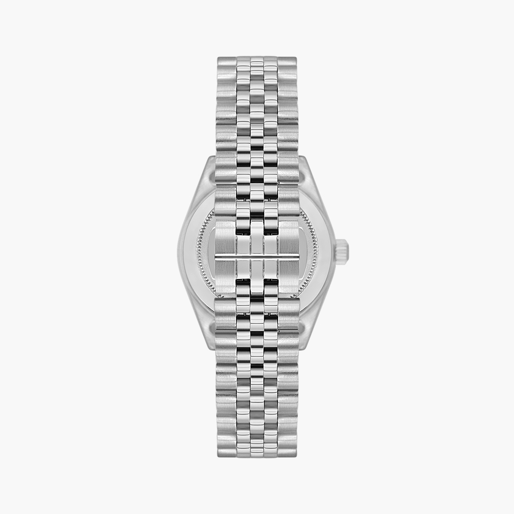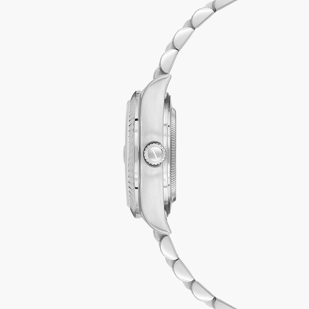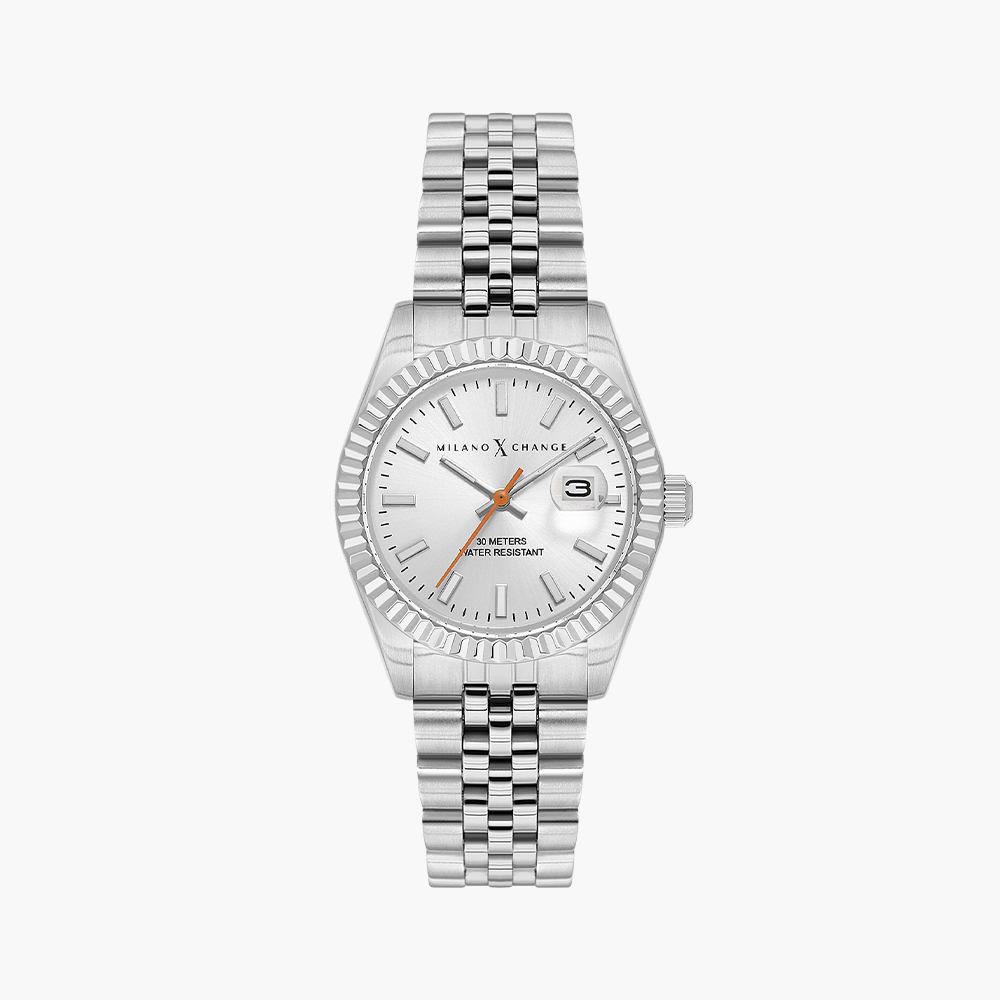 Stainless steel case, Analog quartz movement, Silver dial, Stainless steel bracelet