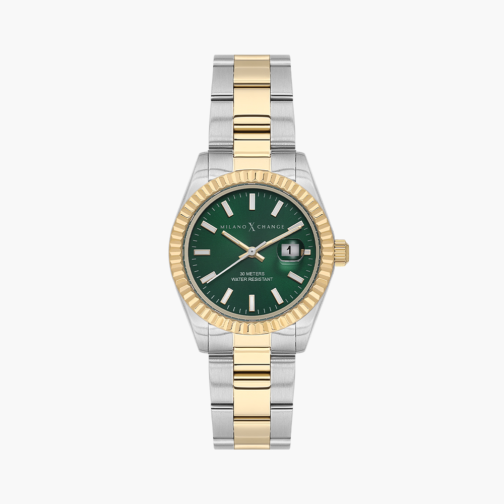 Stainless steel case, Analog quartz movement, Green dial, Stainless steel bracelet